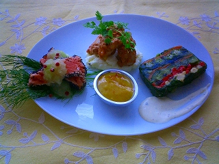 タンドリーチキン・マンゴーソースがメインのワンプレート。左はサーモンのタタキ・メロンドレッシング、右は野菜グレープフルーツよ野菜のテリーヌ。そうです!テーマはフルーツ。