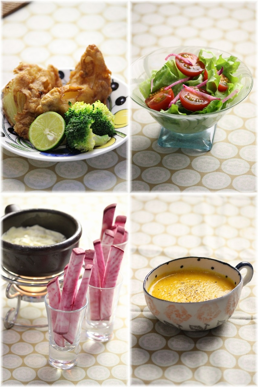 赤カブは最後はそのままスティックサラダに。バーニャカウダ風のソースをからめて