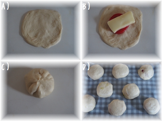麺棒をあて手のひらサイズに広げる。(A)
