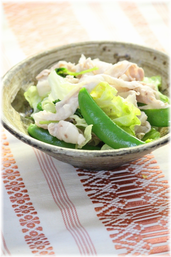 2)鍋にAをあわせて煮たて、すなっぷえんどう・三つ葉・しょうが・豚肉を加え