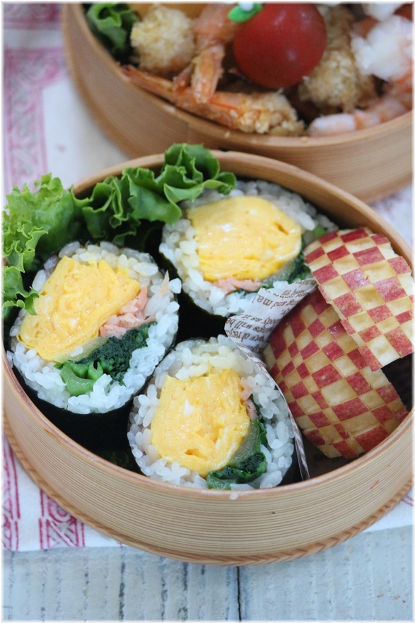 海苔巻きの中は 塩鮭・小松菜・甘めのたまご焼き。