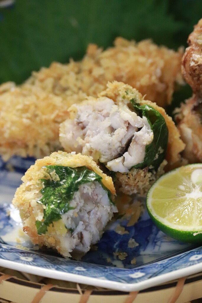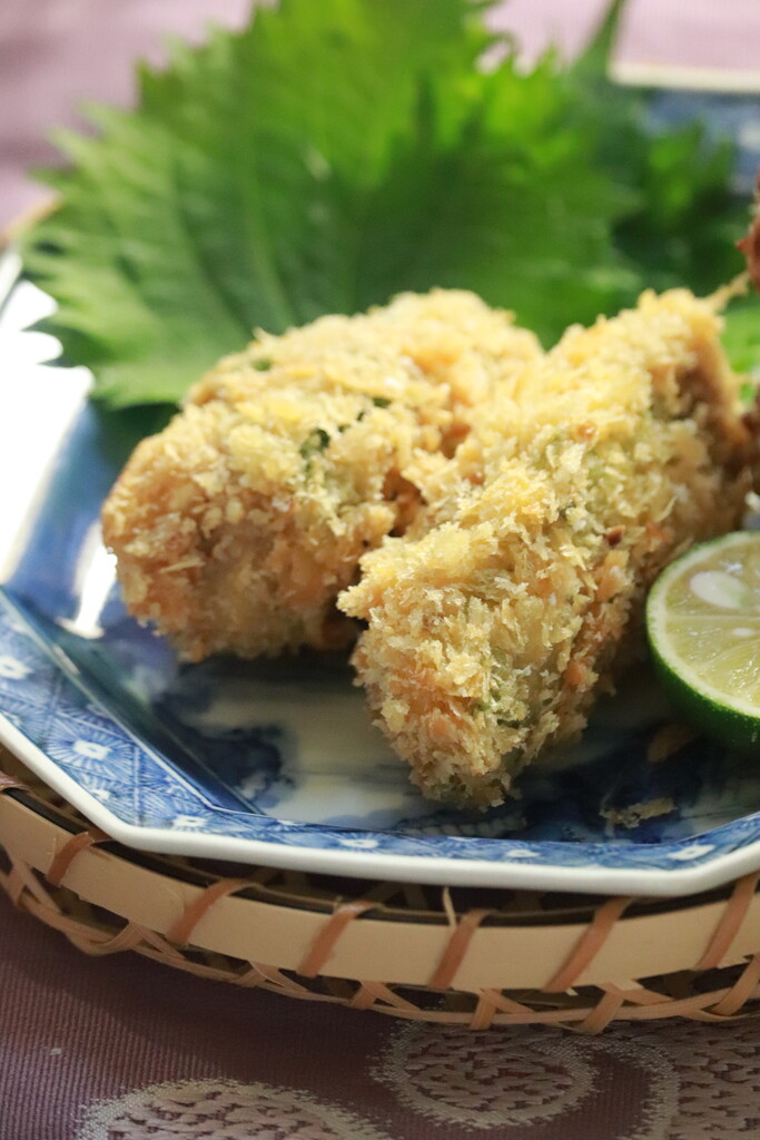 2匹分の鯵の身を重ねて大葉で巻いて揚げました。