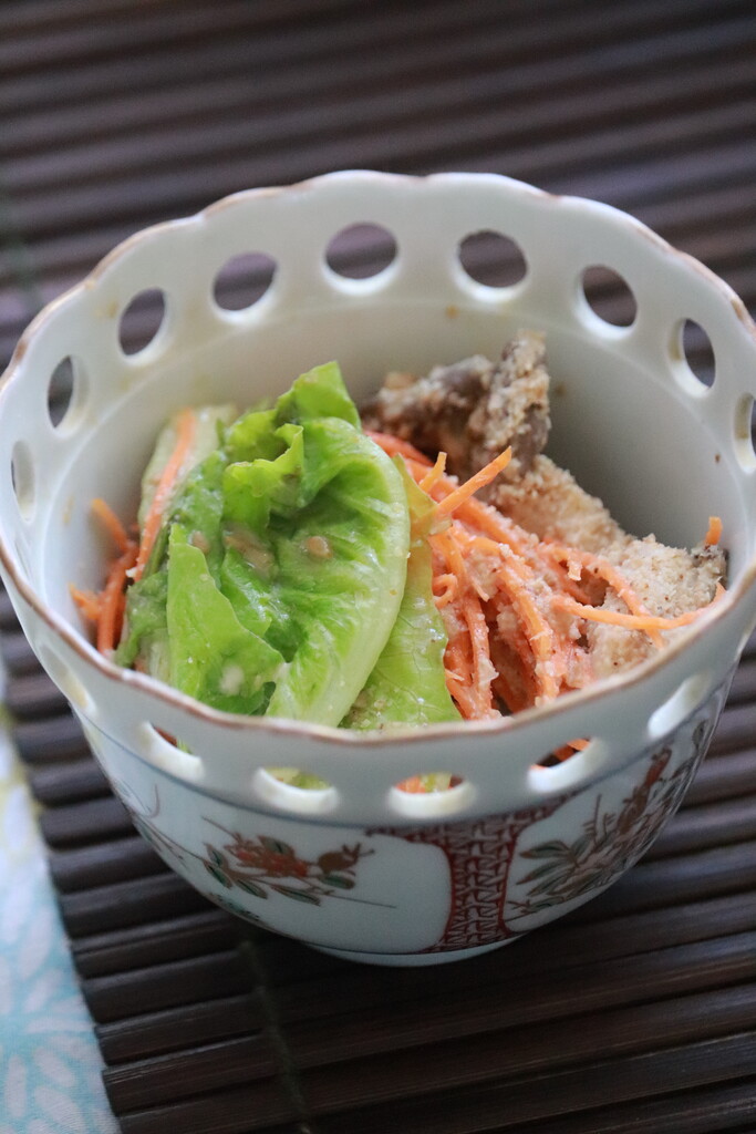 人参・ロメインレタス・ひらたけの胡麻和え。