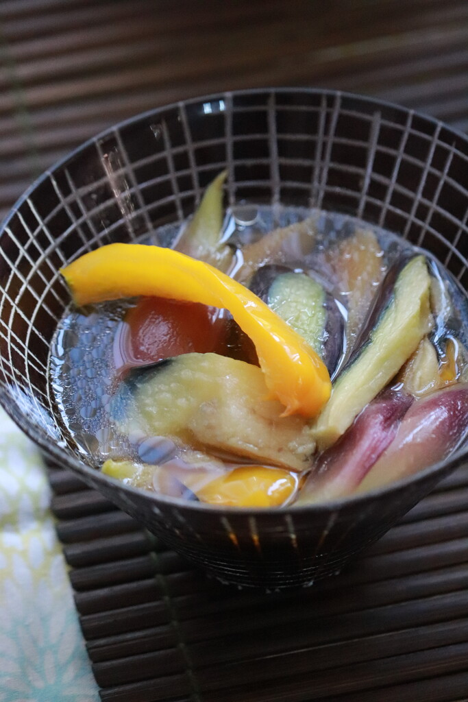 きゅうり粗みじん切り(1本分)大葉細切り(5枚分)、すだちの輪切りをのせ