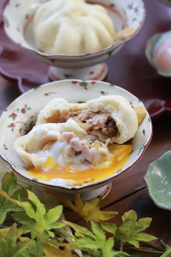 肉まんに温玉絡めるとおいしいんです♪