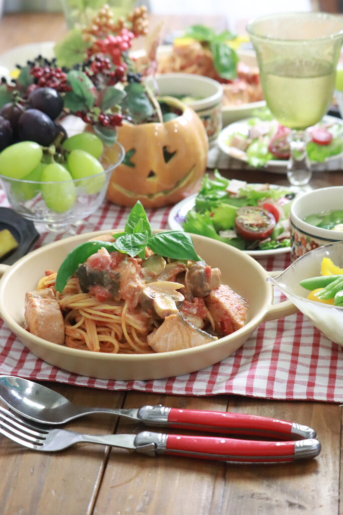 秋鮭ときのこのトマトクリームパスタです。