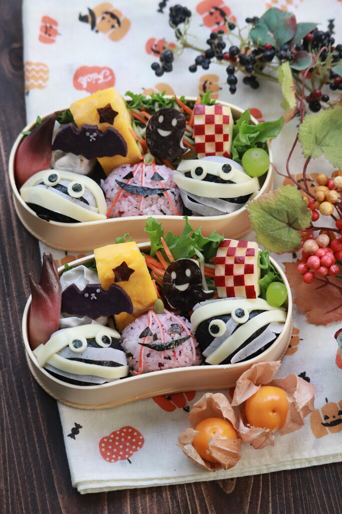 真っ黒ミイラと赤いかぼちゃのお弁当。