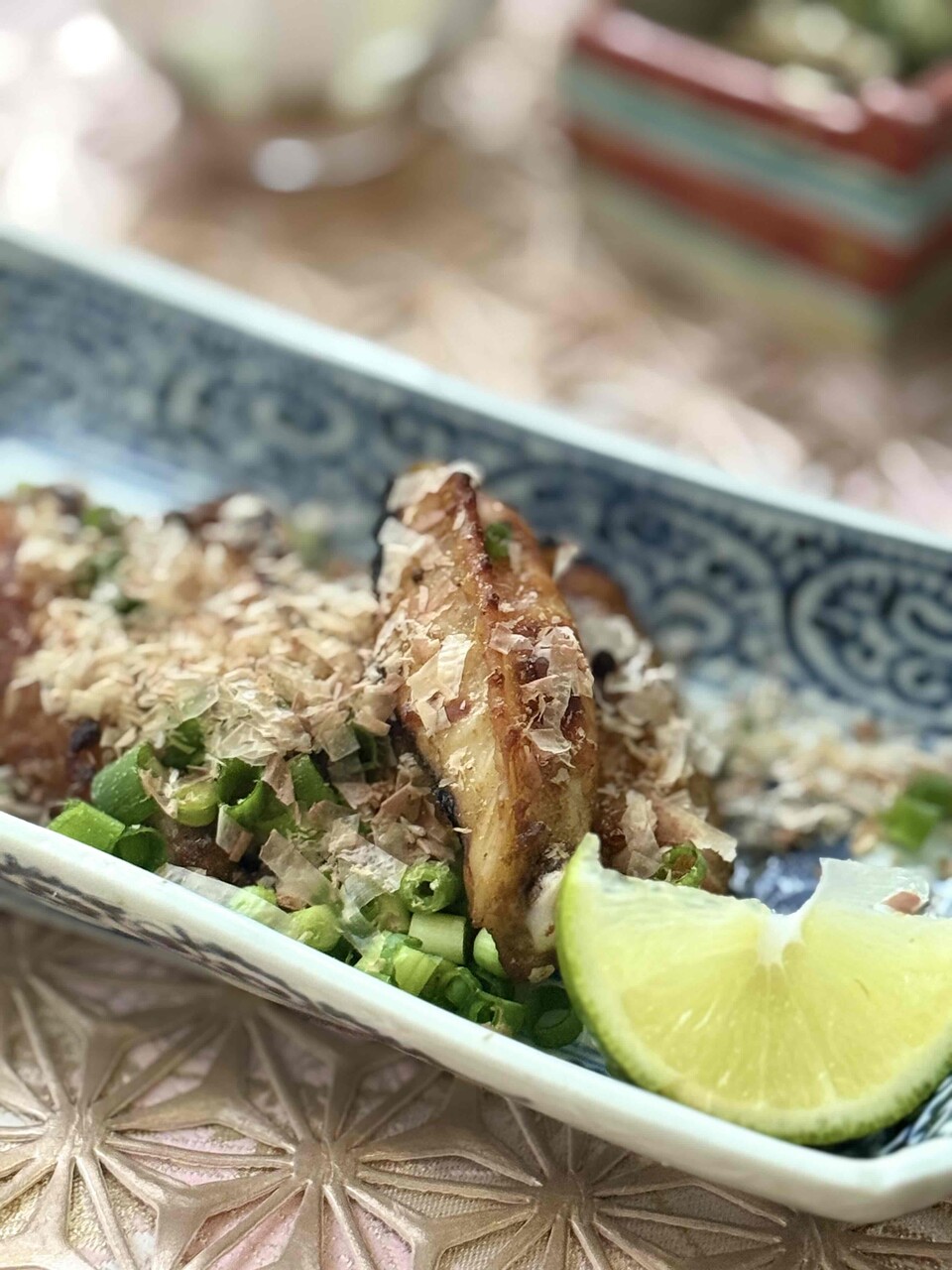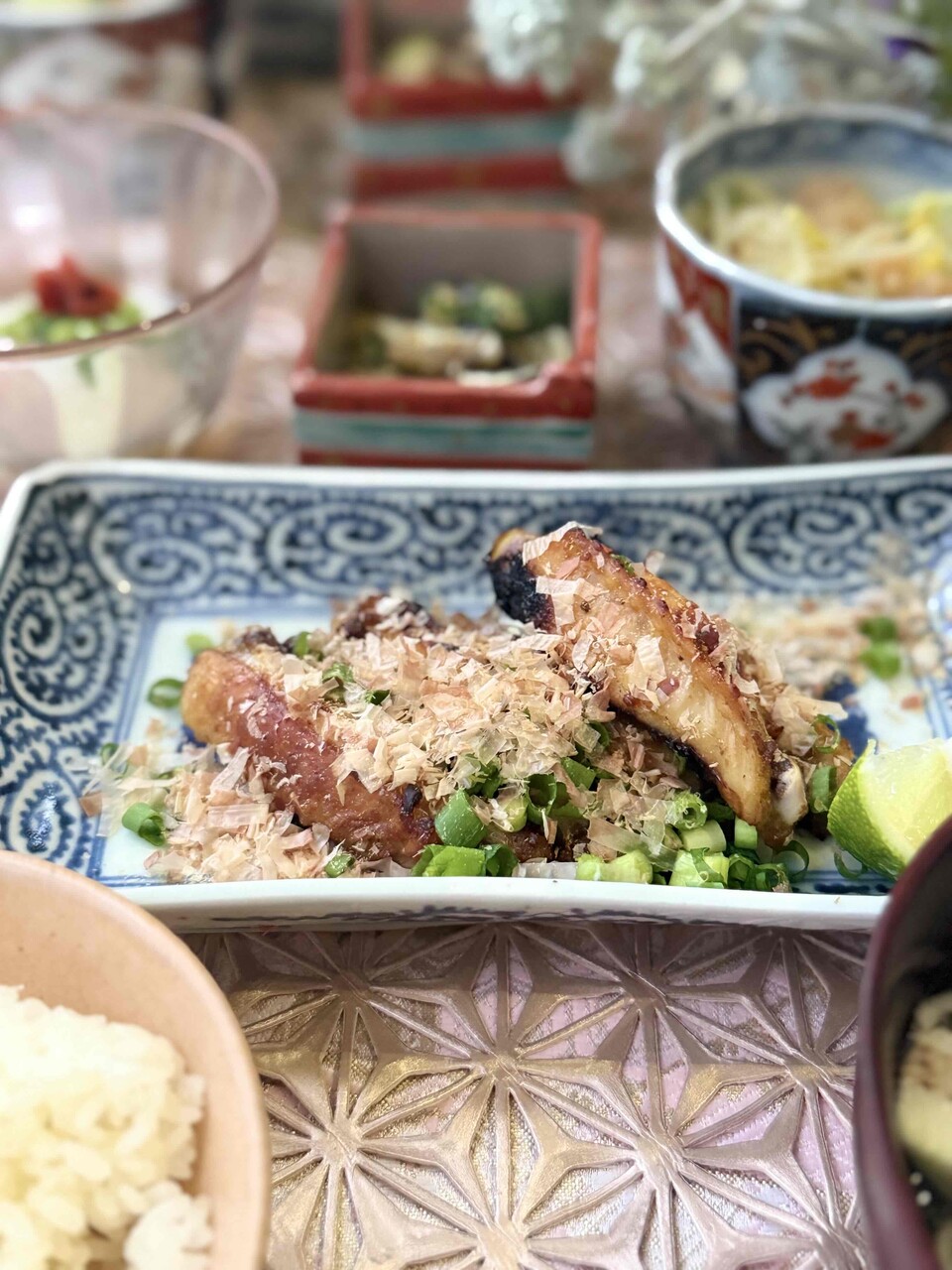 3)青ねぎの小口切り、残りのかつおぶしを散らし、お好みで柑橘を添える。