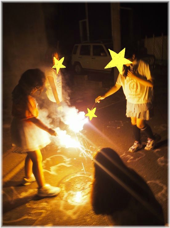 こわごわ花火に火をつけて