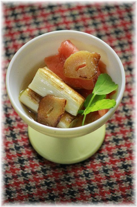 焼き葱とスモークサーモンのホットマリネ。