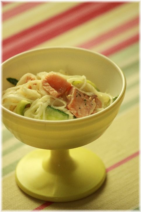 茹でてから解した鮭に(茹でると、焼くより柔らかくて、サラダに良く合います)