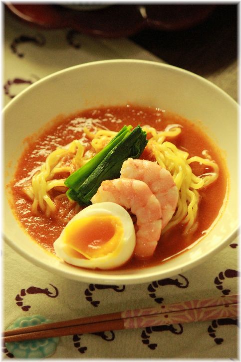 3)器にスープをはり、しっかり水けを切った1の麺をあわせ、お好みでニラ、海老、半熟ゆで卵を添える。