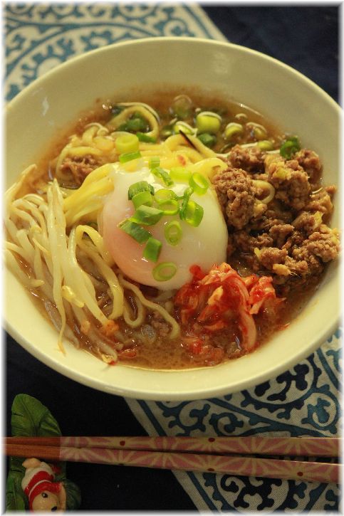 温泉卵、もやし、キムチ、青ネギを盛り付ける。