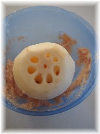 2)蓮根の水気を切って、1のたらこクリームチーズをボウルに入れて、蓮根の切り口を押し付けて蓮根の穴にたらこクリームチーズを入れる。